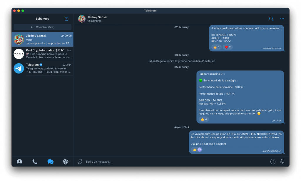Au vu des performances de cette stratégie et des nombreux messages de membres de mon Discord communautaire, j’ai décidé de partager ma stratégie en donnant en temps réel l’ensemble de mes mouvements sur les marchés bourse & crypto. Pour cela, rien de plus simple que d’avoir un espace Telegram expressément réservé pour dire ce que je fais au moment où je le fais.